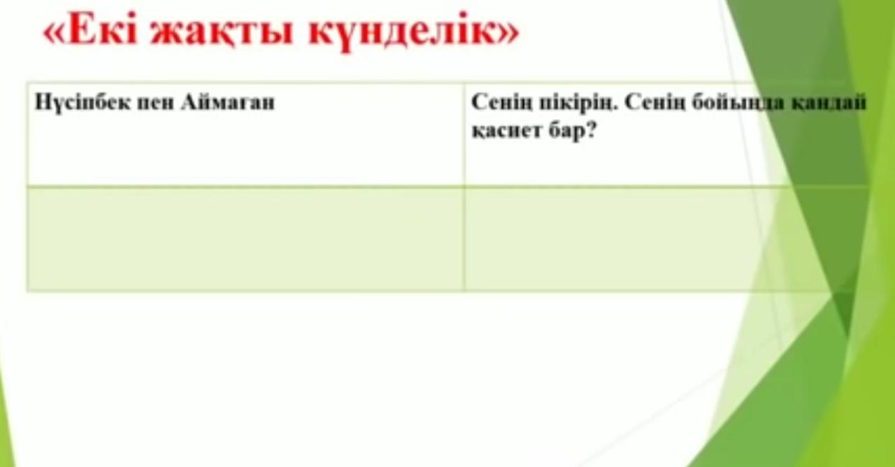 Тыңдалым Әңгімені тыңдау Мәтін бойынша сұрақтар Дескриптор -Әңгімені тыңдайды -Қабылдау сұрақтарына жауап береді ҚБ «Ауызша» Сұрақ жауап 2 минут 1.Нүсіпбектің орнында сен болсаң қайтер едің? Аймағанның орнында болсаң ше? 2. Шала – жансар көк кептерді қалай өлімнен құтқарып қалуға болады? Не істейтініңді рет –ретімен санамалап айт. 3. Нүсіпбек пен Аймаған арасындағы достыққа өз көзқарасыңды білдір. 1 тапсырма