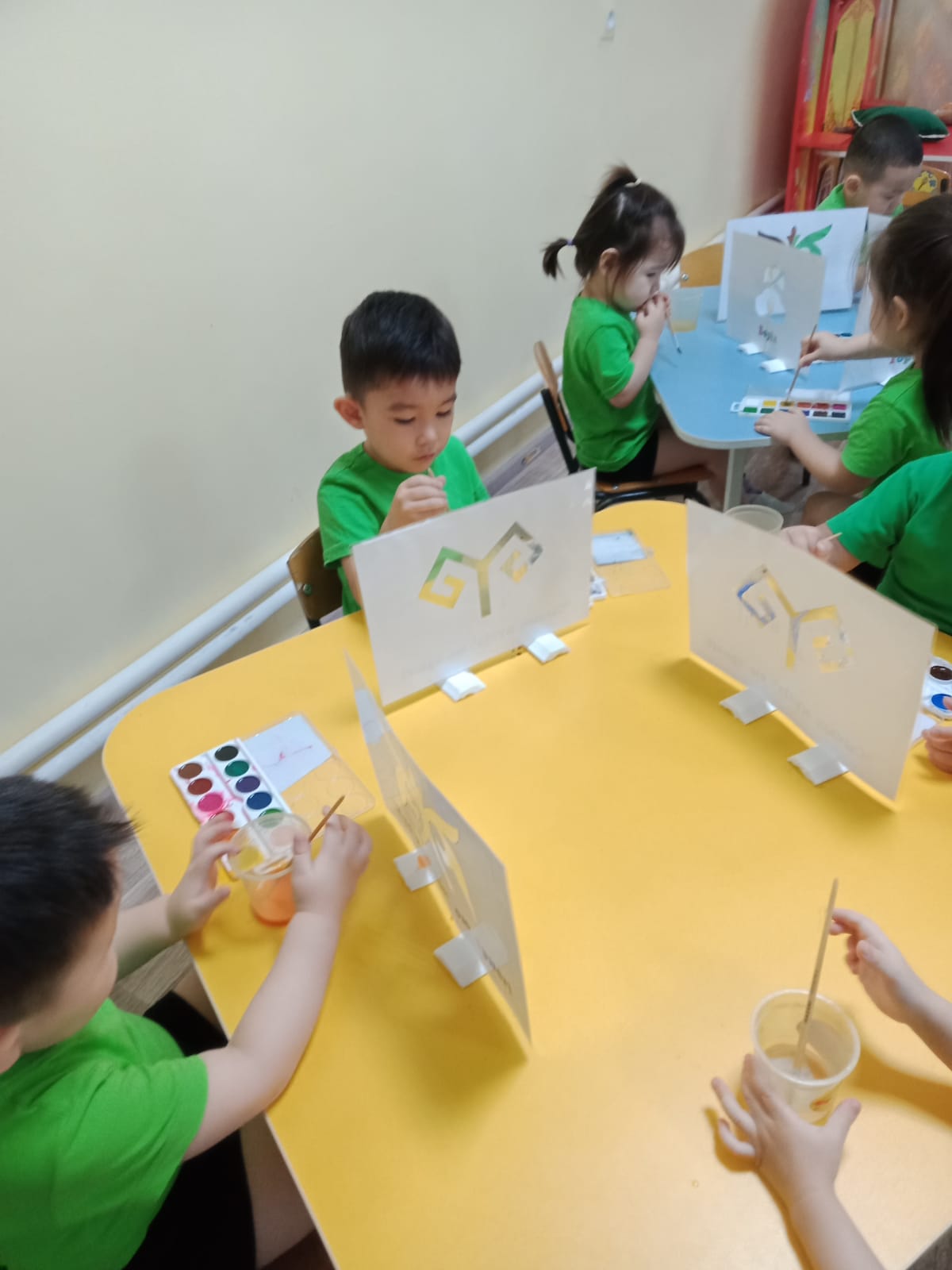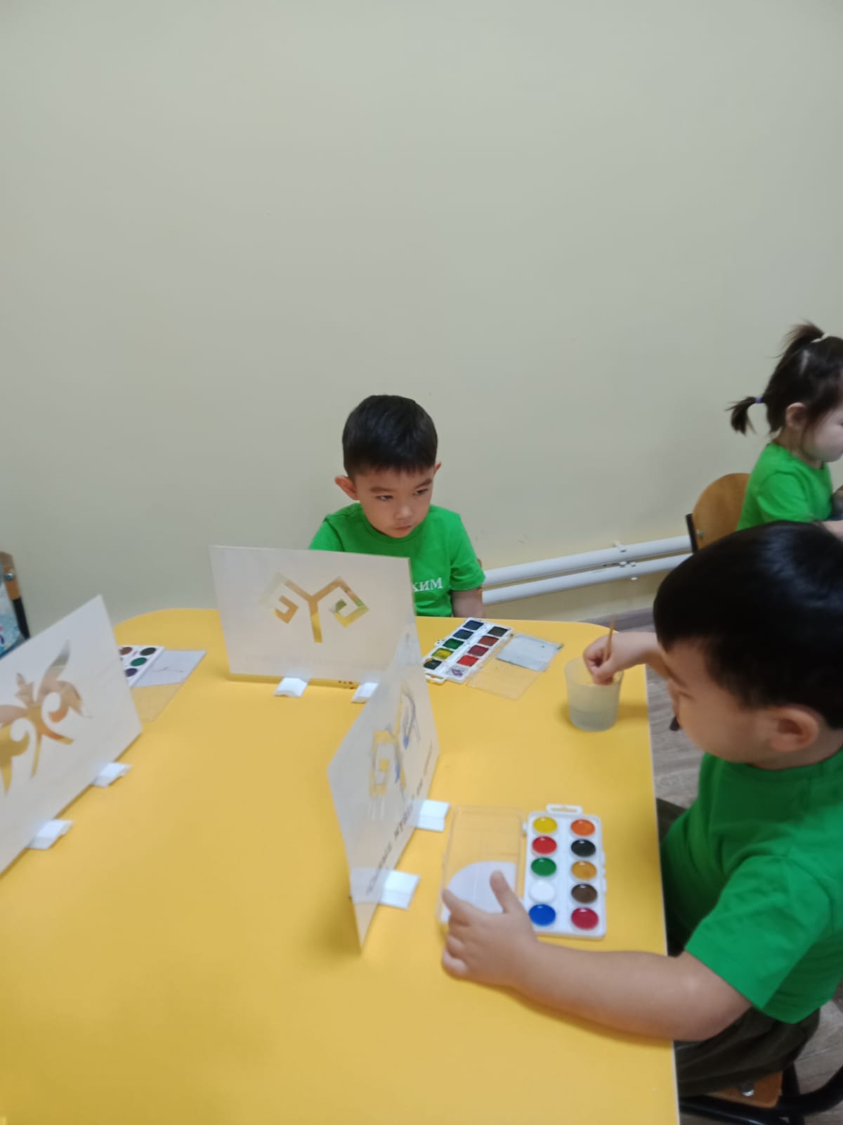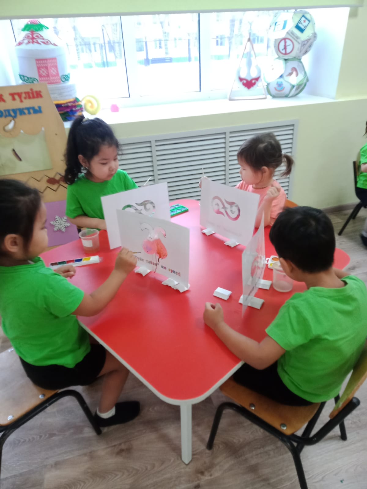 Алдымен балаларға дайын шаблондар таратылады. Олар ою-өрнек сызықтарын қарап, қылқаламмен қалай бояу керектігін түсінеді. Бояу жұмыстары барысында алдымен үлкен элементтер боялады, содан кейін жіңішке қылқаламмен ұсақ бөлшектерді бояу тәсілі үйретіледі. Балалар түстерді үйлестіріп, бояудың біркелкі жағылуын қадағалайды.