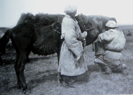 Жылқы шаруашылығының басты өнімі – сүті. Басқа үш түліктің сүтінен айран, құрт, май, ірімшік дайындалатын болса, бие сүтінен бір ғана қымыз ашытылады. Түркі халықтары этнографиясының көрнекті өкілі Л.П. Потапов: «Қымызды ойлап тапқан көшпенділер, себебі нағыз көшпенді халық шыдамды да, жүріске мықты жылқы малын өсірумен айналысқан – дейді. Мына суреттен біз көшпенді халықтың бие сауып жатқан сәтін және қымыз құйылған теріден жасалған қымыз құятын ыдысын көріп отырмыз.