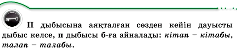 5-тапсырма. Берілген сөздерге ы, і әріптерінің тиістісін қосып жаз. П-ның өзгеру себебін түсіндір. Мектеп, тәртіп, талап, сап, қолғап, шөп. Бүгінгі сабақта дауыссыз п-б дыбыстарының емлесін сақтап жазуды және мұғалімнің көмегімен мәтіннің тақырыбы мен негізгі ойды анықтауды үйрендіңдер. |