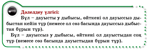 Дауыссыз дыбыс түрлерін (қатаң, ұяң, үнді) ажыратуды үйренесің; Мұғалімнің көмегімен мәтіннің тақырыбы мен негізгі ойды анықтауды меңгересің; |