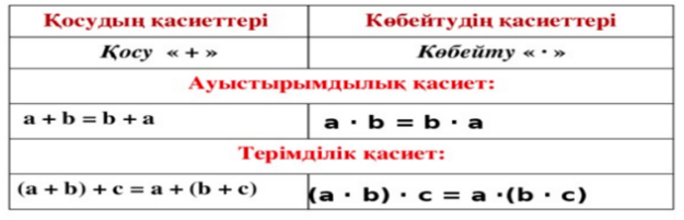 Жаңа материал түсіндіру. Мұғалім қысқаша түрде рационал сандарды қосу мен көбейтудің ауыстырымдылық және терімділік қасиеттерін мысалдармен көрсетіп кетеді. Қосу мен көбейтудің ауыстырымдылық, терімділік қасиеттерін пайдаланып, өрнектерді тиімді ықшамдауға болады.