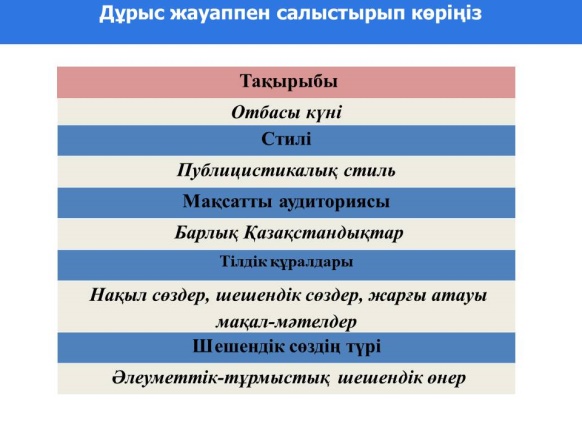 қазақ тілі стильдері мен шешендік сөздің түрлерін қолданылған тілдік құралдар арқылы таниды мақсатты аудиторияның қызығушылығын ынталандыру үшін әртүрлі жанрда мәтіндер құрастырады |