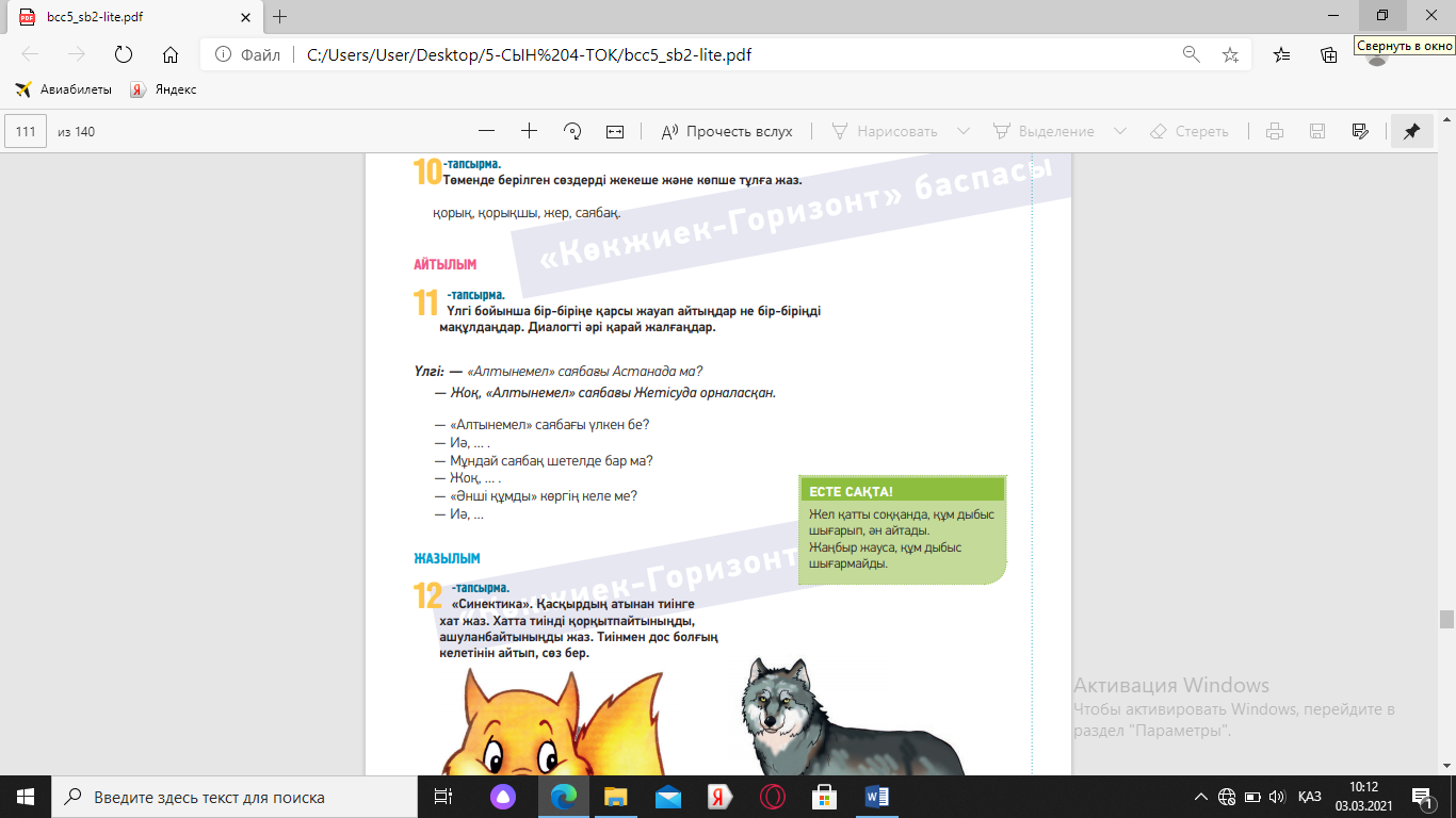 Жазылым. 4-тапсырма. Төмендегі берілген сөздерді жекеше және көпше тұлға жаз. Қорық, қорықшы, жер, саябақ. Айтылым. 5-тапсырма. Үлгі бойынша бір-біріңе қарсы жауап айтыңдар, не бір-біріңді мақұлдаңдар. Диалогті әрі қарай жалғаңдар.
