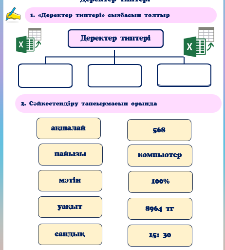 Бағалау критерийі: * Кесте құруды және пішімдеуді біледі. * Деректер типін анықтайды, формулаларды енгізеді. Дескрипторлар 1-топ: - сандық деректер анықтамасын дұрыс береді-1балл -Excel-де дұрыс мысалдар көрсетеді-1балл -сан форматын (%, ондық таңба) көрсете алады-1балл Дескрипторлар 2-топ: -мәтіндік деректерді дұрыс сипаттайды-1балл -мәтін форматталуын түсіндіреді-1балл -Excel-де мысал келтіреді-1балл Дескриптор 3-топ: -дата және уақыт деректерін дұрыс сипаттайды-1балл -дата форматын өзгерте алады-1балл -мысалдарды дұрыс орындайды-1балл Дескрипторлар: - деректер типін дұрыс жазады-1балл Дескриптор: -деректер типі мен оның мысалын дұрыс сәйкестендіреді-1балл Дескриптор: -ашық сұраққа толық жауап жазады-1балл