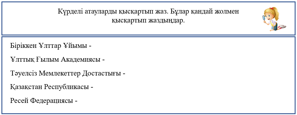 Қысқарған сөздер тақырыбына арналған сабақ жоспары. 4 сынып мұғалімдеріне арналған.