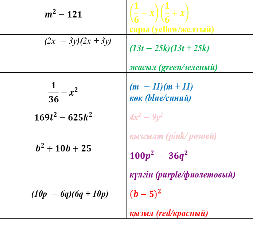 Сұрақтарға жауап береді 1.Көпмүшені көпмүшеге көбейтуді кейбір жағдайларда ықшамырақ орындауға болады. Көпмүшені көбейтудің осы дербес жағдайларын өрнектейтін формулаларды қысқаша көбейту формулалары деп атайды. 2. Екі өрнектің қосындысы фомуласы, екі өрнектің айырымының формуласы, екі өрнектің квадраттарының айырымы формуласы. 3. Кейбір есептерде жылдам шығарып, уақытты үнемдеу үшін керек. 4. Екі өрнектің квадраттарының айырымы осы өрнектердің азайтындысы мен қосындысының көбейтіндісіне тең. Оқушылар дәптерге есепті шығарып жауабына сәйкес бағандағы түсіпен суретті бояйды. |