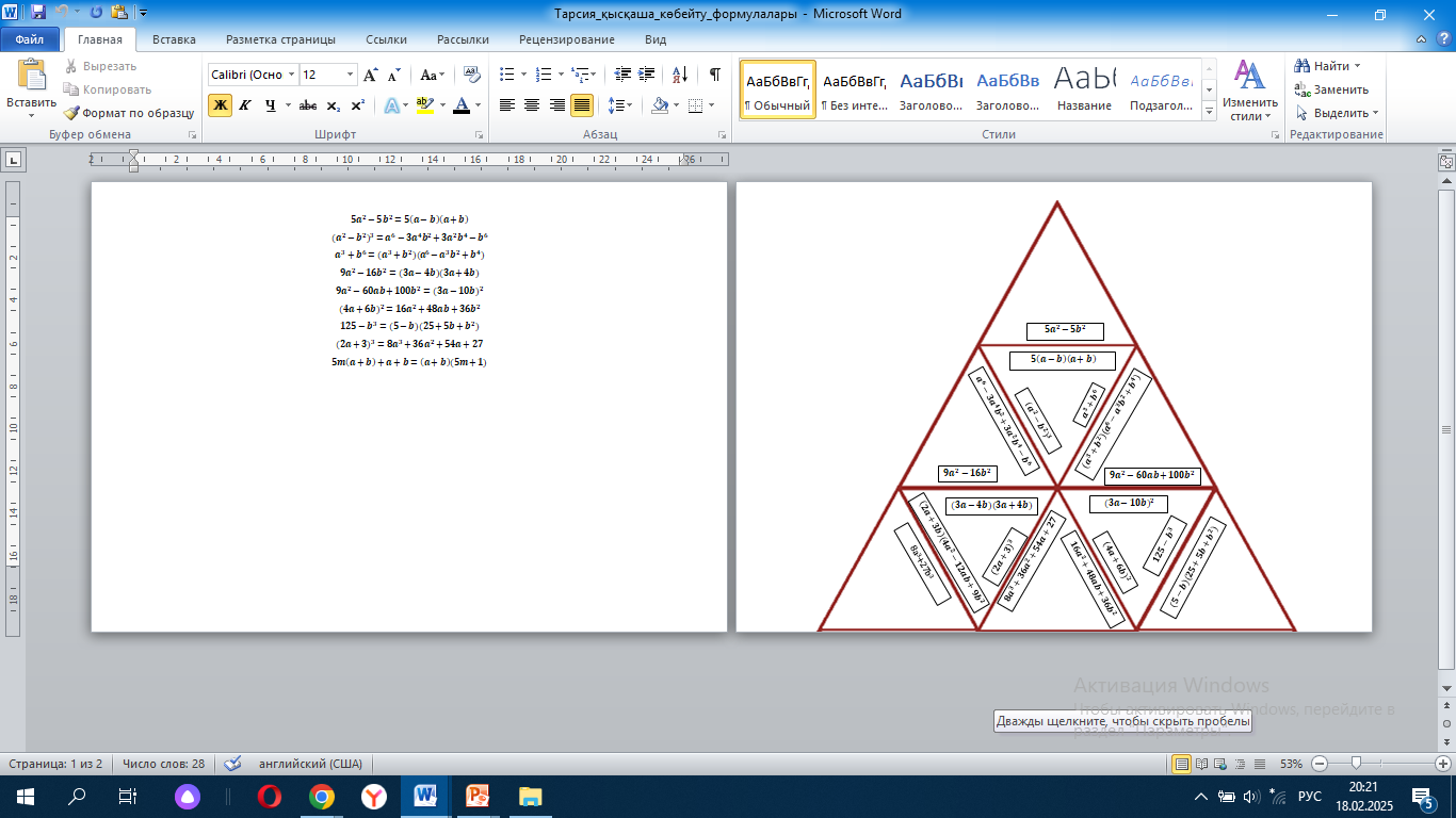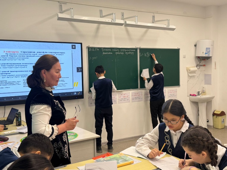 Осыдан кейін біз формулаларды қолдана отырып, әртүрлі алгебралық өрнектерді түрлендірдік. Топтық жұмыс барысында күрделі өрнектерді ықшамдау және тепе-тең түрлендіру тапсырмаларын орындадық