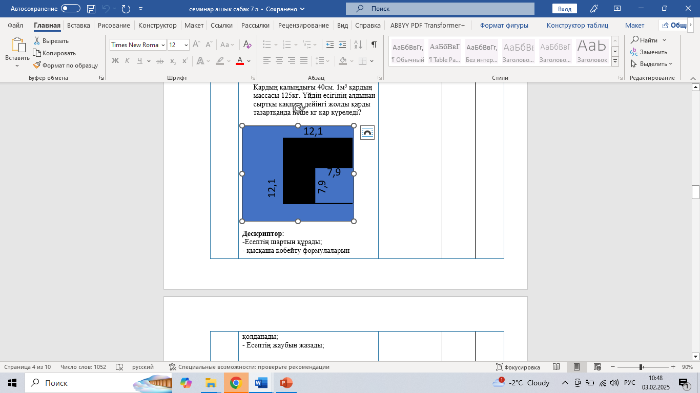 БОӘ «Бірге ойланайық» Тапсырма: Үйдің есінің алдынан сыртқы қақпаға дейін өлшемдері төмендегі суреттегідей жолдың қарын күреп тазарту керек. Жолдың ені оның барлық ұзындығында бірдей 4,2метр. Қардың қалыңдығы 40см. 1м3 қардың массасы 125кг. Үйдің есігінің алдынан сыртқы қақпаға дейінгі жолды қарды тазартқанда неше кг қар күреледі?