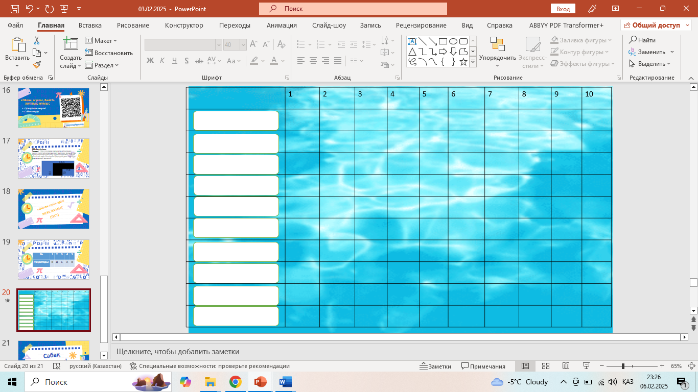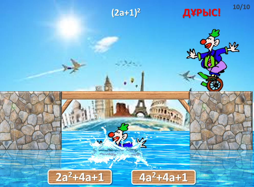Амандасады, сабаққа дайындалады. Оқушылар сәйкестендіру тапсырмаларын орындайды. Жауаптар: 1-D 2-G 3-E 4-B 5-A 6-F 7-C Оқушылар сұрақтарға жауап береді. Дұрыс жауап берсе қылкөпірден өтеді, дұрыс жауап бермесе суға құлайды |
