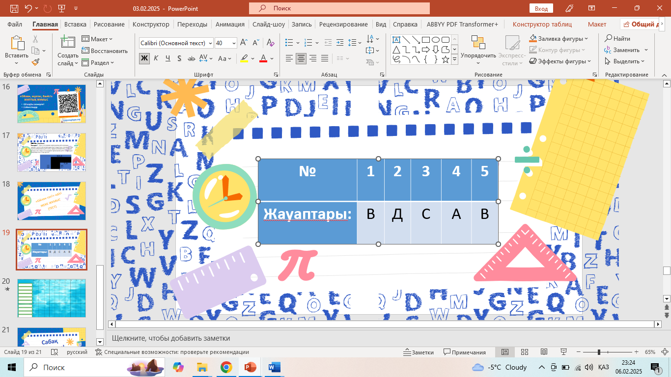 Оқушылар тестті шешеді жауаптарын жазады дәптерге, тақтамен жауаптарын тексереді