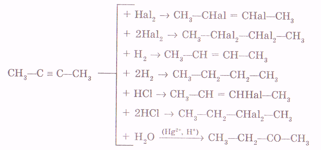 Диметилацетиленнің (бутин-1-дің) қасиеттерін ацетиленнің қасиеттеріне ұксастырып, осы класқа тән реакциялардың теңдеулерін жазамыз: