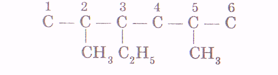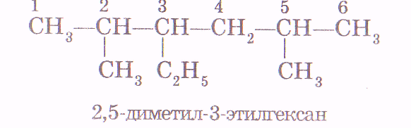 2) Екінші және бесінші көміртек атомдарында екі метил СН3 — топтары (2,5-диметил-) және үшінші көміртекте этил С2Н5— тобы бар. Орынбасар радикалды көрсетілген көміртек атомдарына тіркеп жазамыз: