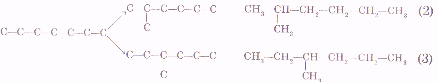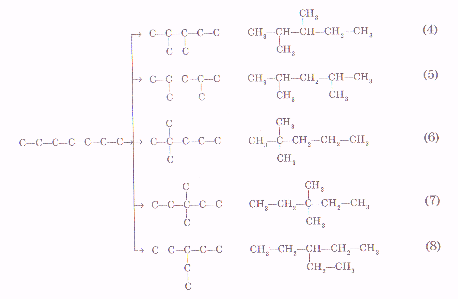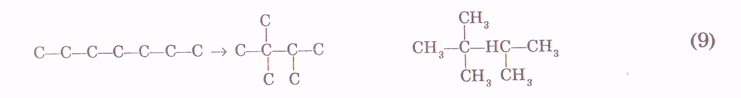 Тізбекті тағы бір көміртек атомына (барлығы үш С атомына) кысқартып, енді үш СН3 тобының орындарын ауыстырамыз. Бірдей қосылыс түзіліл кететін болғандыктан бүл жағдайда бір СН3 пен бір С2Н5 топтарының немесе бір С3Н7 тобының орындарын ауыстыра алмаймыз: