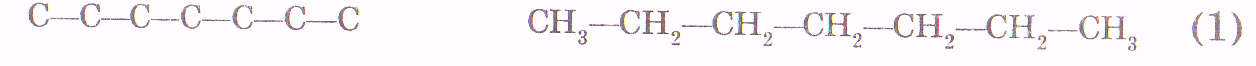 3) Көміртек атомдарының қалған байланыстарын сутек атомдарымен қанықтырамыз. Органикалық қосылыс кұрамындагы көміртек атомдарының төрт валентті болатынын білеміз. Байланысқа бір валенттігін жұмсап тұрған шеткі көміртек атомдары үш сутекпен (бірінші және алтыншы С атомдары), екі көміртек атомдарымен байланысып тұрған ортадағы көміртек атомдары екі сутекпен (төртінші С атомы), ал үш жағынан байланысып тұрған көміртек атомы бір сутекпен (екінші, үшінші және бесінші С атомдары) байланыса алады: