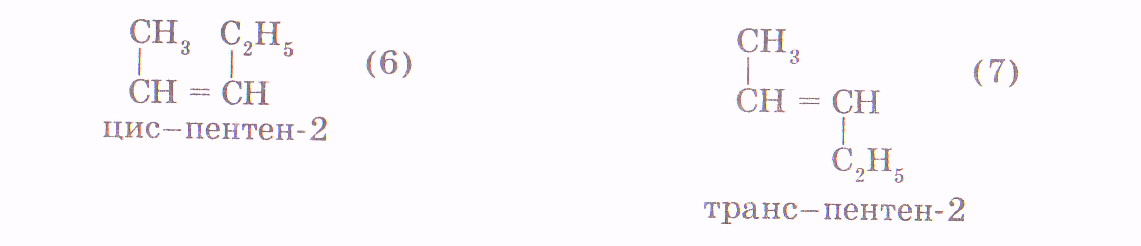 Цис-изомерде радикалдар (СН3— пен С2Н5—) кос байланыстың бір бетінде, транс-изомерде радикалдар қос байланыстың екі жағында орналасады.