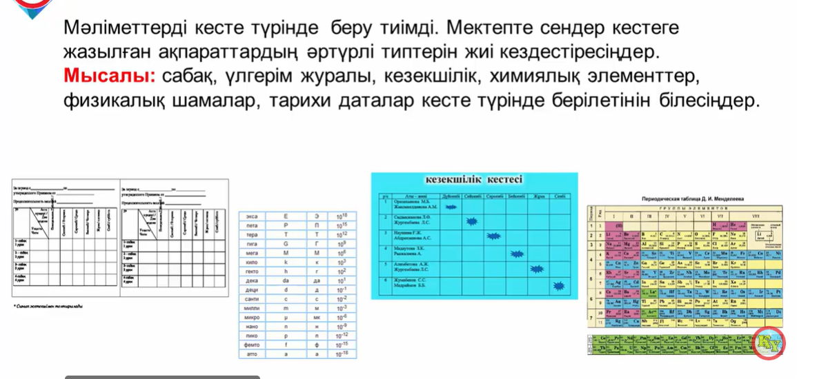 Жаңа тақырыппен танысады Жаңа ақпарат алады Тақырыпқа байланысты бейнематериал қарайды Қажетті анықтамаларды жұмыс дәптеріне жазып алады