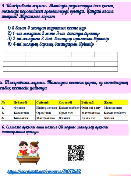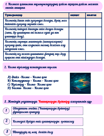 -кесте құру командасын көрсетеді -ұяшықтарды біріктіру алгоритмін құрады -1-тәжірибелік жұмысты орындайды; -2-тәжірибелік жұмысты орындайды; - интерактивті тапсырманы орындайды