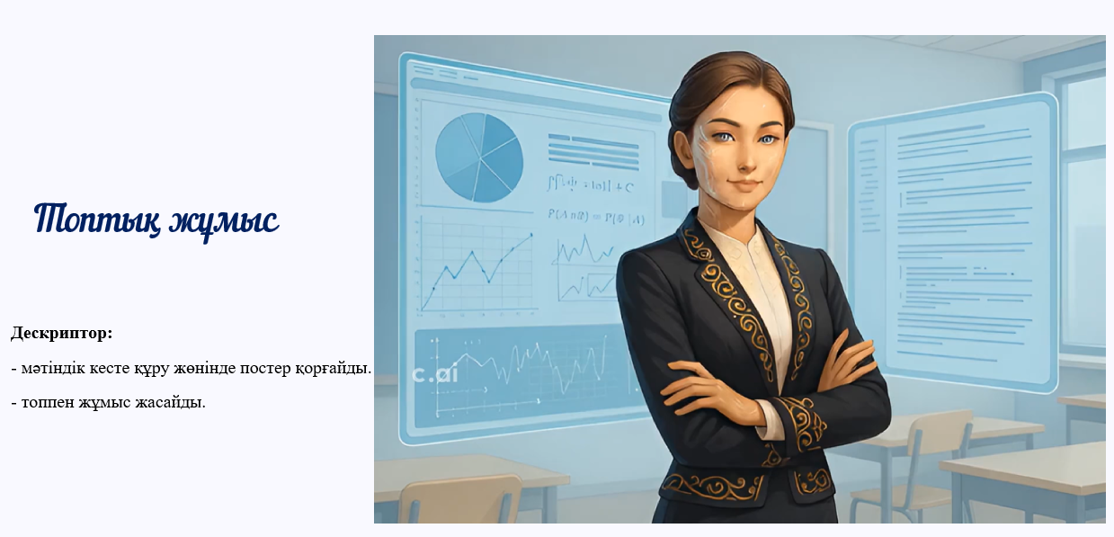 «Мақтау» Дескриптор: - мәтіндік кесте құру жөнінде постер қорғайды. - топпен жұмыс жасайды. 2балл Дескриптор: -ақиқат/жалған тұжырымдарды дұрыс анықтайды-2 балл *команданың ретін дұрыс көрсетеді-1балл *ұяшықтарды біріктіру алгоритмін жұрыс көрсетеді-1балл * 5 бағаннан және 4 жолдан тұратын бастапқы кестені дұрыс құрады-1балл - тиісті бағандарды дұрыс таңдап, оларды біріктіру операциясын орындайды-1балл *2-ші тәжірибелік жұмысты орындайды-2балл |