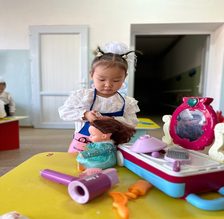 Балалар өздері ойлап тапқан көмек көрсету әрекеттерін қуыршақтарына орындап береді.