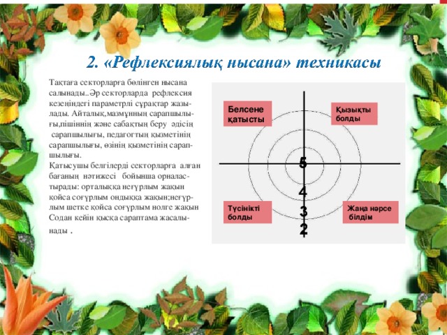 Сіз өткізген сабақ туралы ойлану үшін төмендегі орынды пайдаланыңыз. Сол жақтағы бағандағы сіздің сабағыңызға анағұрлым тән сұрақтарға жауап беріңіз. |