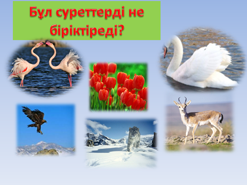 Білу және түсіну «Сиқырлы сұрақтар» Суретте нелерді көріп тұрсындар? -Бұларды не біріктіреді? -Азайған аң-құстарды қайда енгізген? -Кітаптың түсі неліктен қызыл болады? 1-тапсырма «Ойлан тап» әдісі Сурет бойынша бүгінгі сабақтың тақырыбын ашады Тірек сөздер арқылы тақырыпқа байланысты сөйлемдер құрайды