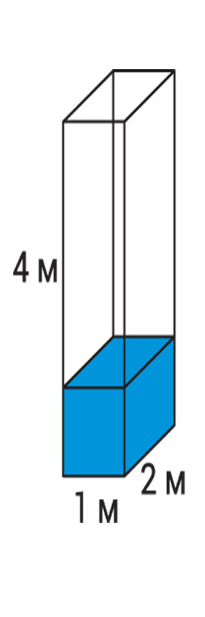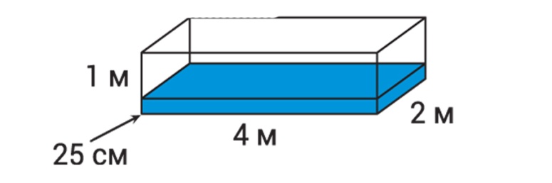 1x2x4 метр өлшемдегі жабық аквариумға 25 см қабат су құйылды (сол жақтағы сурет). Осыдан кейін аквариум 1x2 метр тіктөртбұрыш оның негізі болатындай етіп бұрылды (оң сурет). Ондағы су қабатының қалыңдығы қазір қанша?