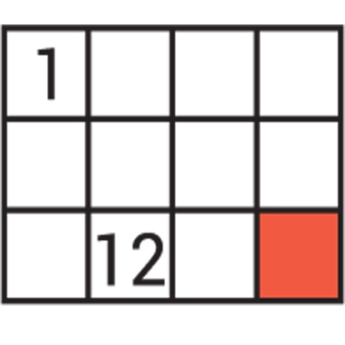 Миша 3х4 кестенің әрбір ұяшығын 1-ден 12-ге дейінгі натурал санмен жазады, осылайша қатардағы сандар ортақ жағы бар ұяшықтарда орналасады. Миша кестеге 1 және 12 сандарын қойып үлгерді. Көлеңкеленген қорапқа ол қандай санды жазады?