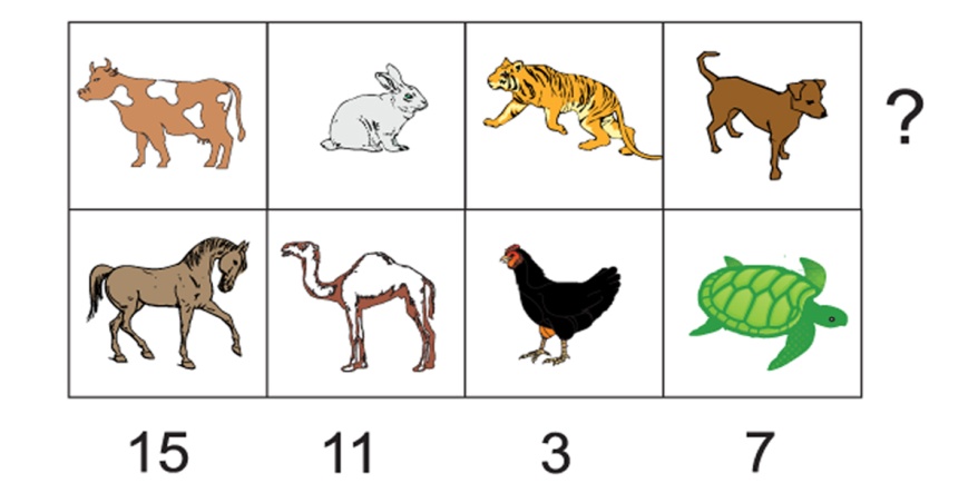 Кестеде әртүрлі жануарларға әртүрлі натурал сандар берілген. Әр бағанның астында сол бағандағы екі жануарға сәйкес сандардың қосындысы берілген. Бірінші жолдағы сандардың мүмкін болатын ең үлкен қосындысы қандай?