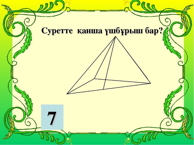 №1. Математикалық жаңылтпаштарды жаттап ал. Қырық үш қызғыш құсқа, Қырық үш қызғыш құсты қосса, Қанша қызғыш құс болады? Атпақ ек бір-бір құр, Атпақ ек бір-бір құр, Қу екен құр құрғыр. Таптырмай қырдан құр, Қайттық біз құрдан құр. №2. Санға байланысты мақал- мәтелдер жалғасын тап: 1. Жеті жұрттың тілін біл, жеті түрлі ілім іл. 2.Білекті 1-ді жығар, білімді мыңды жығар. 3. 2 жақсы қас болмас, екі жаман дос болмас. 4.100 сомың болғанша, жүз досың болсын. 5.30 тістен шыққан сөз, отыз рулы елге тарайды. 6. 1 кісі қазған бұлақтан, мың кісі су ішеді. 7. 30 күн оразаның, бір айты бар. №3. Ойлан тап! №4. Есепті шығар. 1. Дина, Әділжан, Арнат, Мансур төртеуі таразыға түсіп, салмақтарын анықтады.Сонда өлшеу нәтежелері-37 кг.,42 кг.,39 кг., және 40 кг. болды. Әділжан Динадан ауыр, бірақ Мансурдан жеңіл, ал Арнат Динадан жеңіл. Бұл балалардың салмақтары қандай? Жауабы: 2. Ұшақ 7 сағ 35 минутта ұшып кетіп, 10 сағ 20 минутта ұшып келді. Ұшақ неше уақыттан кейін ұшып келді? Жауабы: 3. Отбасында 10 бала бар. Ең үлкені 20 жаста, әр келесі баланың жасы 2 жасқа кіші. Ең кіші бала неше жаста? Жауабы: 2. Марат 6-шы қабатта тұрады, ал Жанат 3-ші қабатта тұрады. Егер Мараттың үйіне дейін 60 баспалдақ болса, Жанаттың үйіне дейін неше баспалдақ бар? Жауабы: №5. Боя. 3-ашық жасыл, 4-қызыл, 5-жасыл, 6-сары, 7-сәбіз сары, 8-көк, 9-малина түстес, 10-қара көк, 63- ашық көк. Есіңе сақта, жаттап ал!