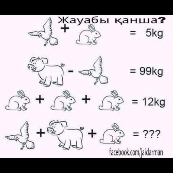 №4. Екі қасқыр, сегіз қоян, Жеті қораз, тоғыз жылан, Екі бұғы, сегіз түлкі, Нешеу болды барлығы? Жауабы: 36 Үш асқабақ, бес сәбіз, Жеті қызылша, төрт картоп, Бес қызанақ, алты пияз, Нешеу болды барлығы? Жауабы: 30 №5. Бір отбасында 4 бала бар. Олардың жастары: 5, 8, 13, 15 жас. Олардың аттары Бақдәулет, Ерсұлтан, Сәния, Гүлнұр. Осы балалардың жастарын анықтайық. Қыздардың біреуі бала бақшаға барады, Гүлнұр Ерсұлтаннан үлкен, ал Гүлнұрдың жасын Сәнияның жасына бөлсең 3 шығады. Жауабы: