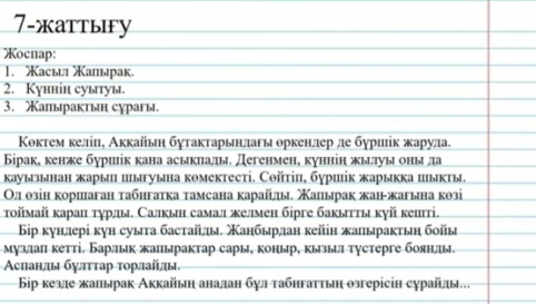 «Біртұтас тәрбие» тәрбие бағдарламасындағы құндылықтарды оқу процесіне ұйымдастыру кезіңінен бастап, сабақтың әрбір кезеңінде жүргіземін. Құндылық мақсаты: Еңбекке, еңбек адамдарына деген құрмет көрсету Үй тапсырмасын тексеру Оқу тапсырмасын тексеру: 51 – жаттығу. Ойлан,тап. ЖИ: «wordwall.» ойыны Жаңа тақырып Айтылым. Оқылым ФС тапсырмасы Саралау: мазмұнды саралау 1-тапсырма Ертегіні мұқият тыңда. Жапырақ. Ертегінің басқа бөлігінде жылдың қай мезгілі туралы айтылған? Не жапырақ жайды? Кеже бүршік қайтті? Ол қандай жапыраққа айналды? Жасыл жапырақ табиғаттың қандай көріністеріне қайран қалды? Тірек сөздер:көктем,аққайың,асықпады,жасыл,құстардың сайрағаны,табиғат сұлулығы,күз,сары,қоңыр,қызыл,табиғатзаңдылығы. ЕБҚ 2-тапсырма Ертегіге ат таңда. Жапыра. Жасыл жапырақ. 3-тапсырма Жоспарға сәйкес ертегі бөліктерін тап. 1.Жасыл Жапырақ 2.Күннің суытуы 3.Жапырақтың сұрағы 4-тапсырма Жоспар және өзің белгілеген тірек сөздердің көмегімен «Жапырақ» ертегісінің мазмұнын айтып көр. 5-тапсырма Өркен- өсімдік сабағында бүршіктер түбінен пайда болатын желі. Бүр жару-бүршіктену Қауыз-астық дәннің қабығы Құлақ түру- елеңдеу,назар аудару. Күй кешу- адамның өмірді сезінуінің қалпы,жағдайы Мұздау-тоңу,жаурау,қалтырау.
