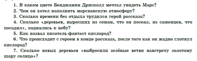 3.Упр. 3. Составьте «Ромашку вопросов» к рассказу Рэя Брэдбери «Зелёное утро» и ответьте на них. Задания для второй группы: 1. Упр. 1. Прочитайте фантастический рассказ Рэя Брэдбери. Как вы думаете, почему произведение называется «Зеленое утро»? 2.Упр. 2. Ответьте на «толстые» вопросы. 3.Упр. 5. «Ассоциативный куст». Запишите вокруг ключевого слова Марс все возможные ассоциации.