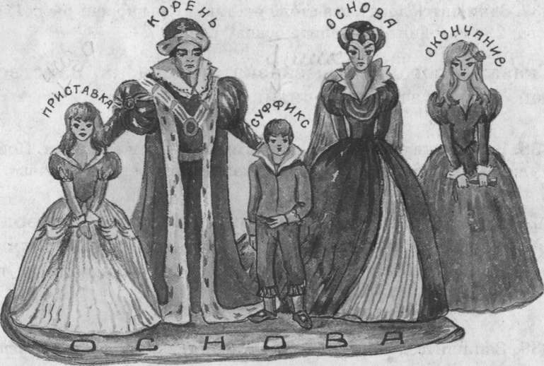 и платье старенькое, и место последнее. И рассказывая на балах о графстве Слово, она всегда говорила, что живут они вчетвером: Приставка, Корень, Суффикс и она - графиня Основа.