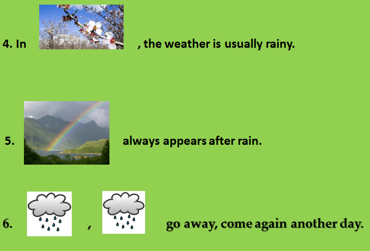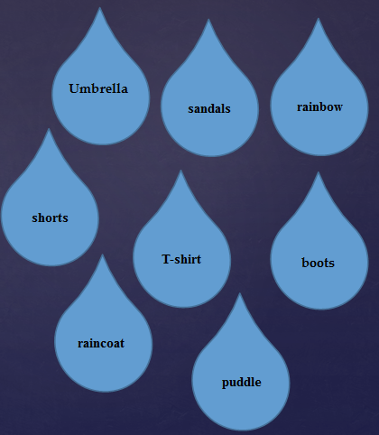 Pupils listen and sing song Pupils repeat the new words Find matches Pupils listen to the teacher attentively Choose the right drawings They make up proposals Choose words suitable for rainy weather |