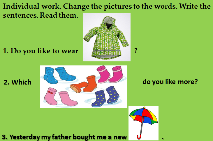 1. I need boots when it’s rainy. Жаңбырлы күні маған резеңке аяқ киім қажет. 2. I don’t need sandals. Маған сандал (жеңіл аяқ киім) қажет емес.