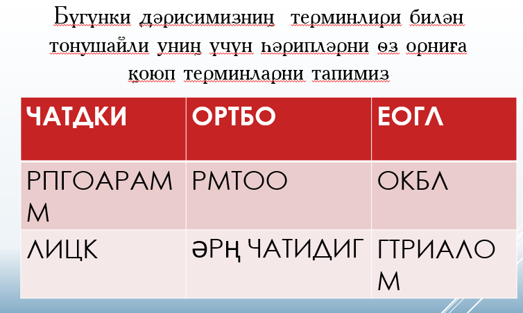 Оқуғучилар муәллим билән саламлишип олтириду. Топ билән ойлинип ребусни йешиду. Интерактивлиқ тахтидин орунлайду Оқуғучилар рәтләш арқилиқ термин сөзләр билән тонишиду.