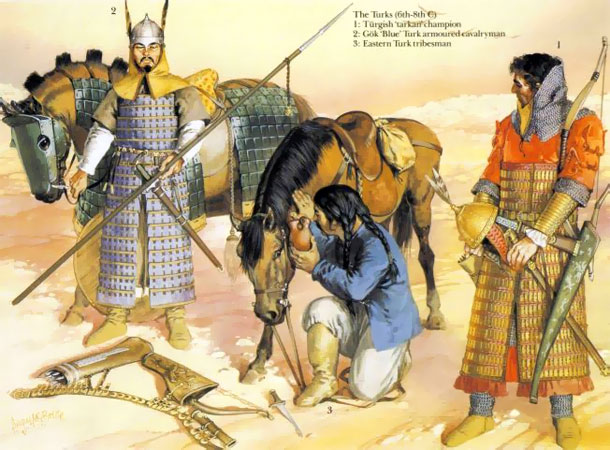 В VI в. западные походы 10 тюркских туменов возглавил младший брат Бумыня Иштеми (Истеми), который покорил согдийцев и племена Алтая. Тюрки к 555 году захватили земли до Аральского моря. За короткое время они завоевали огромную территорию от Китая до Амударьи, весь Присырдарьинский регион. Земли Казахстана подпали под власть Тюркского каганата в VI в. В Средней Азии эфталиты(хиониты-белые гунны) оказали упорное сопротивление тюркам. Эфталиты - это оседлые племена Средней Азии, жившие на землях от Каспийского моря до Северного Индостана и Восточного Туркестана. Тюрки заключили союз с Ираном (Персией), против Эфталитов. 563-567 гг. Тюрки покорили Эфталитов и взяли под свой контроль Великий Шелковый Путь. В 70-е годы VI века Тюркский каганат расширил свои владения до Северного Кавказа и северного побережья Черного моря. Таким образом, во 2-ой половине VI в. Тюркский каганат превратился в могущественную державу по своему политическому положению. Государственное устройствоТюркская государственность называлась каганат. Каган - верховный правитель тюркского государства. Древние тюрки называли свою столицу «Орда», власть «тер» (глава; почетное место). Шедших в бою впереди военачальников - «берi» (волк), «кырги» (ястреб). Тюркютский род, правителей тюркских каганатов, происходящий по легенде от внука волчицы называли Ашина. - «Ашина» означает «благородный волк». Основателями династий считаются Бумын (cm. ветвь) и Иштеми (мл. ветвь) каганы. Престол наследовался по лестничному принципу: «старшему брату наследовал младший, племянник дяде». ХозяйствоОсновным видом хозяйства населения было полукочевое и кочевое скотоводство. Традиционно выращивалось 4 вида скота. С завоеванием Жетысу и Средней Азии часть тюрков начинает переходить к оседлому образу жизни. В историческом памятнике «Письмена Культегина» встречаются сведения и о городских поселениях. А также археологические исследования сообщают, что особенно много месторасположений зимовок-кентов, в которых жили тюрки, обнаружены близ города Тараз. Культура