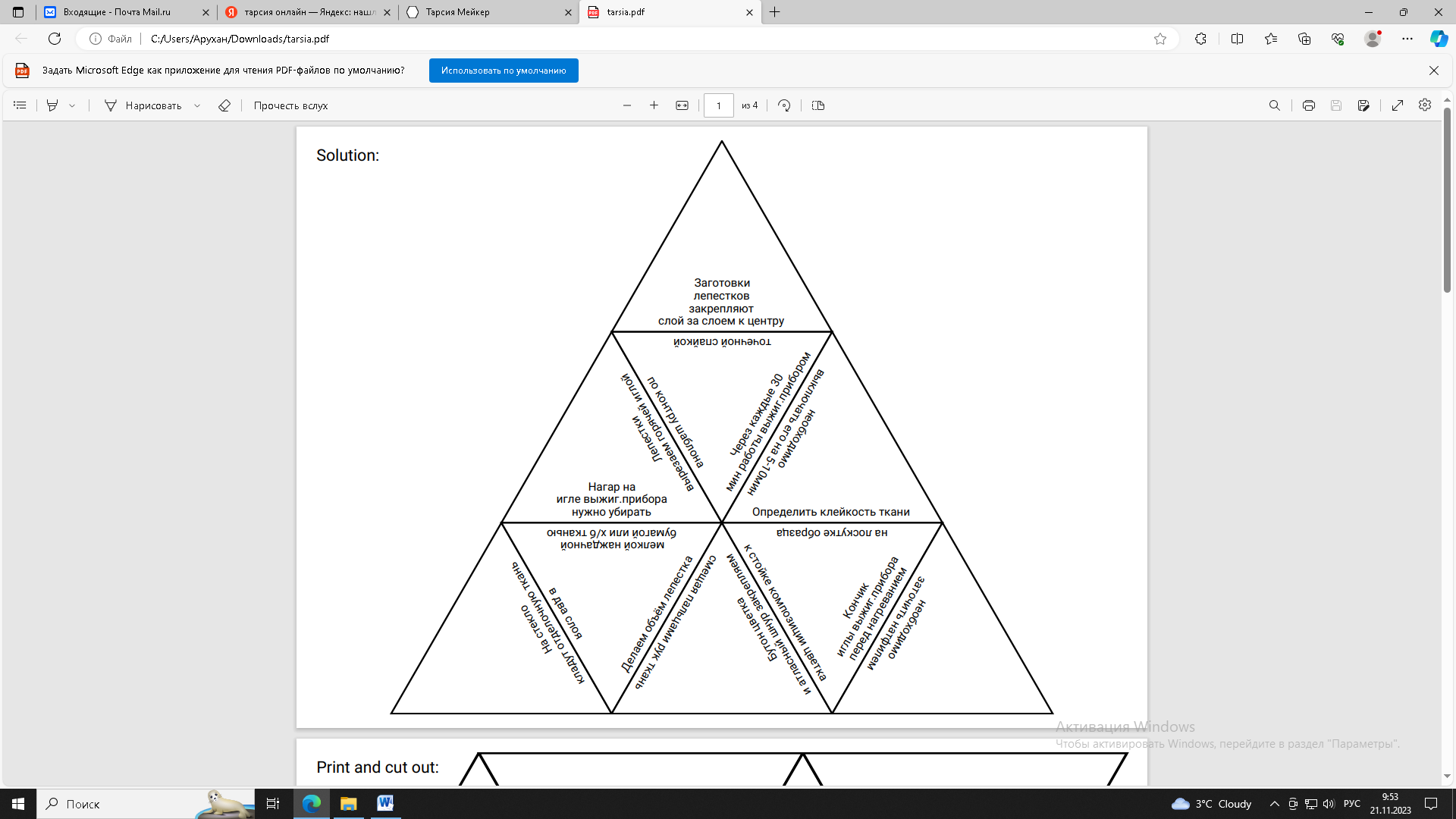 Данная головоломка сделана из бумаги и поделена на девять треугольников. На каждом треугольнике написано предложение касающееся теме урока: «Сборка цветка в технике гильоширования». Чтобы продолжить предложение, вам нужно рассмотреть каждый из треугольников и найти продолжение текста или фразу, которая продолжит логический или смысловой ряд. Попробуйте внимательно рассмотреть каждый треугольник и найти соответствующее продолжение.