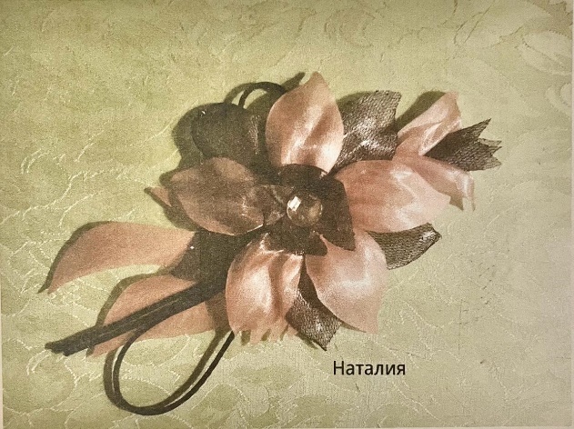 1. Для декорирования цветка приготовим: собранный цветок, атласный шнур, лист цветка, бутон цветка, стразу (для украшения центра цветка) и застёжку. Берём атласную ленту или шнур, складываем его и красиво закрепляем к листу цветка «точечной сваркой».
