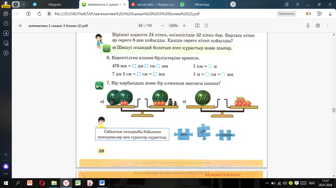 Оқулық №1, 57-бет Оқулық №3(а) 58-бет Дәптер Қалам сап |