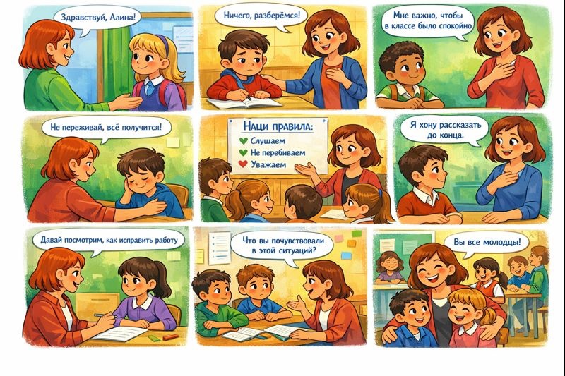 Приведённые примеры педагогического общения показывают, что эмоциональный климат класса формируется через повседневные, на первый взгляд незаметные действия педагога. Осознанное использование данных приёмов способствует развитию эмоционального интеллекта учащихся и созданию психологически комфортной образовательной среды.