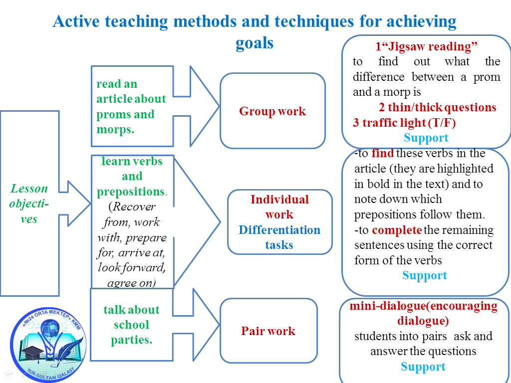read an article about proms and morps. learn verbs and prepositions. talk about school parties. Identify the main idea in extended talks with little support Identify details in a text with little support Interact in a pair, group and a whole class work |