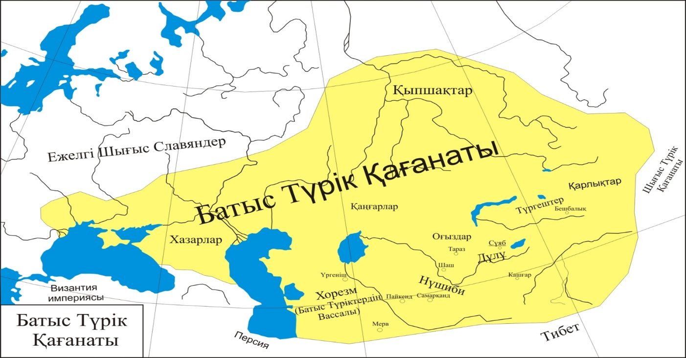 Ұлы Түрік қағандығы (552- 603) ыдырап, оның екіге бөлінуі нәтижесінде пайда болған ерте ортағасырлық түркілер мемлекетінің бірі – Батыс Түрік қағандығы (603- 704). Ұлы Түрік қағандығында саяси-әлеуметтік қайшылықтардың шиеленісуі, оның дербестікке ұмтылған жеке бөліктерінде оқшалану үрдісінің күшеюі Шығыс және Батыс қағандықтардың құрылуына алып келді (603). Жылнамашылардың жазбаларында Батыс Түрік қағандығы негізінен бұрынғы үйсін жерлерінде құрылған, демек, оның аумағы ендік бағытта Қаратаудың шығыс баурайынан Жоңғарияға дейінгі жерді алып жатты. Қағанаттың негізгі этникалық-саяси ұйытқысы – «он тайпа» он оқ будунның мекендеген жері де осы еді. Сонымен қатар, ол Түрік қағанатының Шығыс Түркістан мен Орта Азиядағы (Самарқанд, Маймург, Кеш, Нахшеб, Иштихан, Кушания, Бұхара, Амуль және Андхой) отырықшы-егіншілік жұрттарындағы басып алған барлық жерлерінің мұрагері болды. Батыс түріктеріне тәуелді деген аты ғана болған Соғды мен Бүхарада да қағанның наместниктері, яғни, оның өкілдері болды ( Қазақстан тарихы.1 том.А.,1996.300.б.).