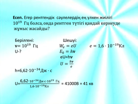 9.6.1.5 рентген сәулесін электромагниттік сәулелердің басқа түрлерімен салыстыру; 9.6.1.6 рентген сәулесін қолдануға мысалдар келтіру |