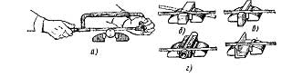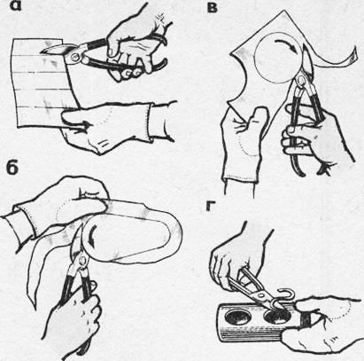 1. Держать ножницы в правой руке, охватывая ручки четырьмя пальцами и прижимая их к ладони; мизинец помещают между ручками ножниц, сжатые указательный и средний пальцы разжимают, выпрямляют мизинец и его усилием отводят нижнюю ручку ножниц на необходимый угол.
