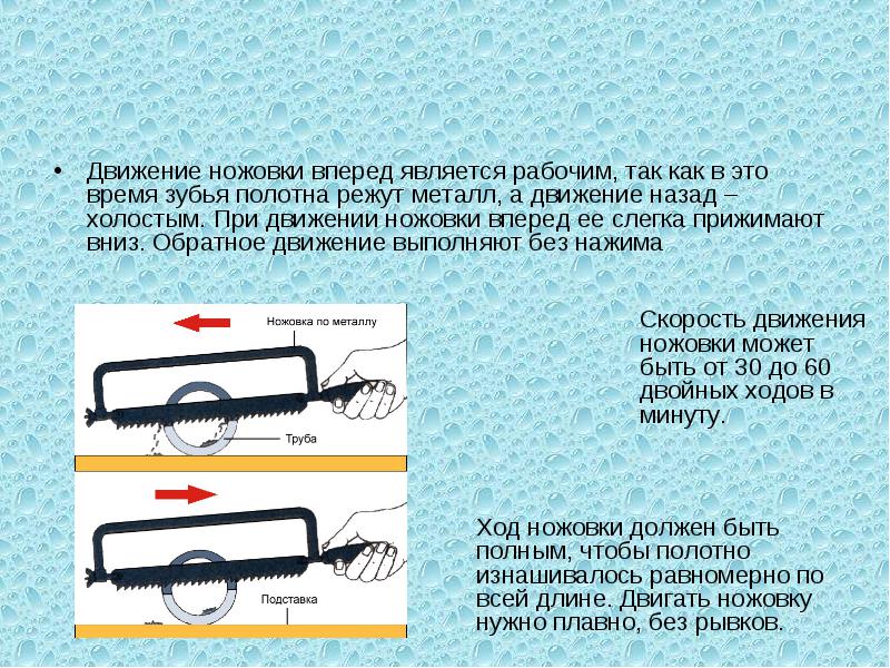 - в работе должно участвовать не менее ¾ ножовочного полотна делать 40-50 рабочих движений в минуту, нажим на ножовку делать только при движении вперед ( вперед - рабочий ход, назад - холостой);