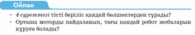 Дескриптор: -Орташа моторды пайдаланып, тағы қандай робот жабдықтарын құруға болатынын айтады Жұптық жұмыс 2 -тапсырма «Ойлан. Жұптас. Бөліс» тәсілі Оқушылар берілген тапсырма бойынша жұптасып, ақылдасып, бір-бірлеріне ойларымен бөліседі, кестеге толтырып, дәптерге жазады