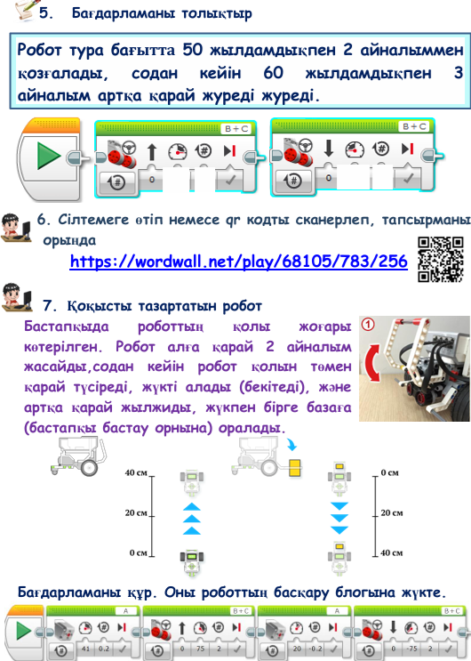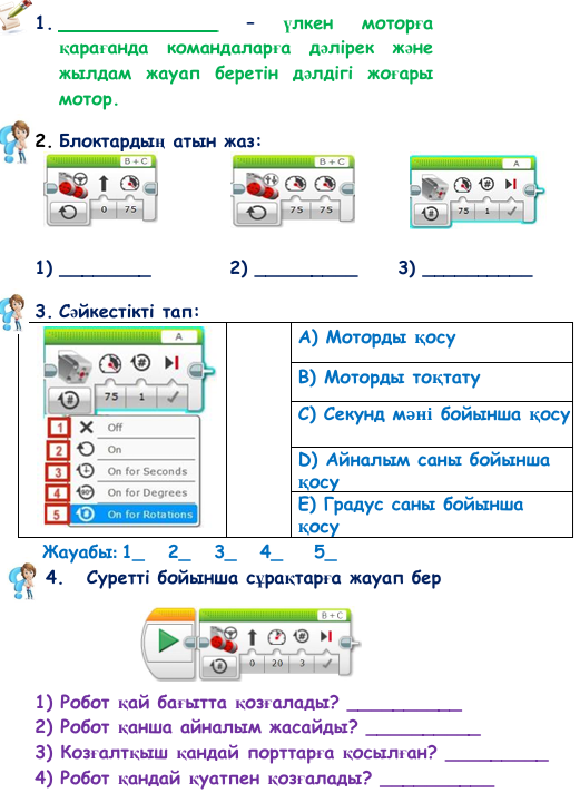 Жаңа ақпаратты тыңдайды, сұрақтарға жауап береді Тапсырманы жұппен орындайды Тапсырманы топпен орындайды Жұмыс парағы бойынша тапсырмаларды орындайды. Дескрипторлар: - бос орынды толтырады - блоктардың аталуын жазады - сәйкестікті белгілейді - сұрақтарға жауап жазады Сергіту жаттығуларын орындайды - бағдарламаны толықтырады - интерактивті тапсырманы орындайды - роботқа арналған программаны құрады |