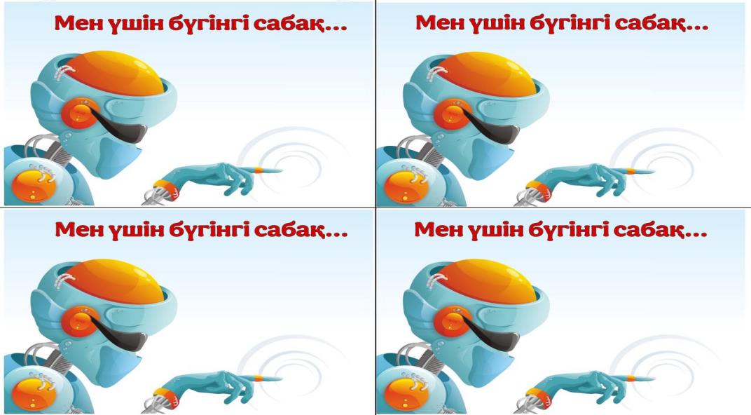 1.Оқушылармен амандасу. 2.Психологиялық ахуал «Мен Роботпын» Оқушылар әр түрлі роботтардың дауысын салып, өздерінің көңіл – күйлерін сипаттайдыы. Мысалы: Менің есімім-Жанат. Менің көңіл күйім тамаша! т.с.с оқушылар бір-бірден айтып шығады. Топқа бөлу Роботтар арқылы бөліну Оқушылар мұғалімнің қолынан Робот таңдау арқылы топтарға бөлінеді
